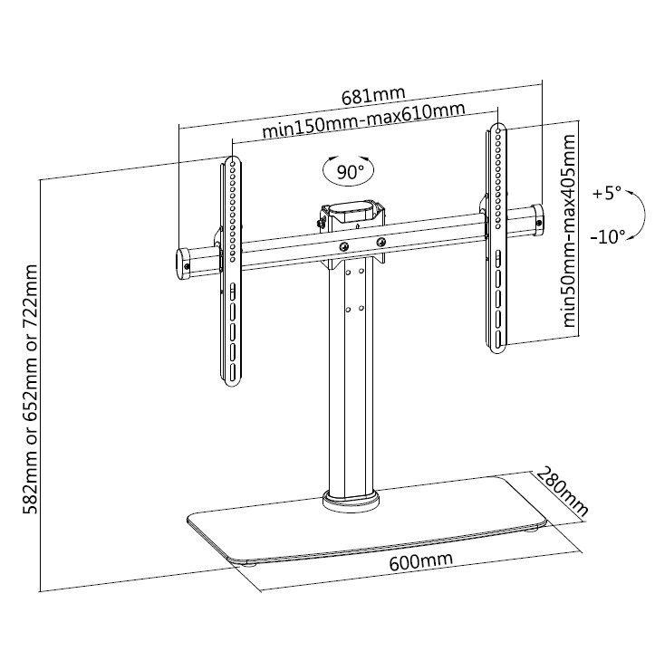 Настольная подставка iTECHmount KFG-3 с наклонно-поворотным кронштейном для телевизора, станет отличным решением, при необходимости установить телевизор на горизонтальную поверхность. Стильный дизайн подставки из черного закаленного стекла, возможность регулировать высоту расположения телевизора на уровне 582 мм, 652 мм или 722 мм от поверхности стола, являются основными преимуществами и отличной альтернативой стандартным подставкам, идущим в комплекте с телевизорами. Надежная конструкция из высококачественной стали, закаленное стекло толщиной 8 мм, позволит надежно установить Ваш телевизор диагональю от 32" до 65", весом не более 40 кг. Данная модель кронштейна позволит Вам так же регулировать угол наклона телевизора в диапазоне до 5° вверх и до 10° вниз, а так же повернуть экран на 90°.