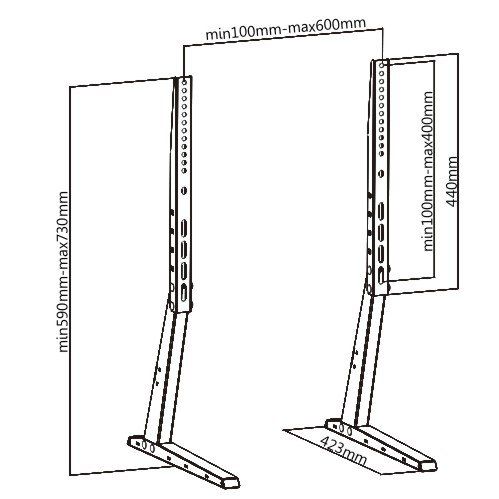 Настольная подставка для телевизора iTECHmount KF-1 - это отличная замена для стандартной подставки, которая поставляется в комплекте с телевизором. Изготовленная из высококачественной стали, данная подставка будет служить надежной опорой для любого телевизора диагональю 37" - 70" и весом не более 35 кг. Подставка регулируется по высоте на уровне 590 - 730 мм. Простота сборки и понятная инструкция в комплекте не отнимет у Вас много времени на монтаж, а минималистичный дизайн и черный матовый цвет будут органично смотреться в любом интерьере.