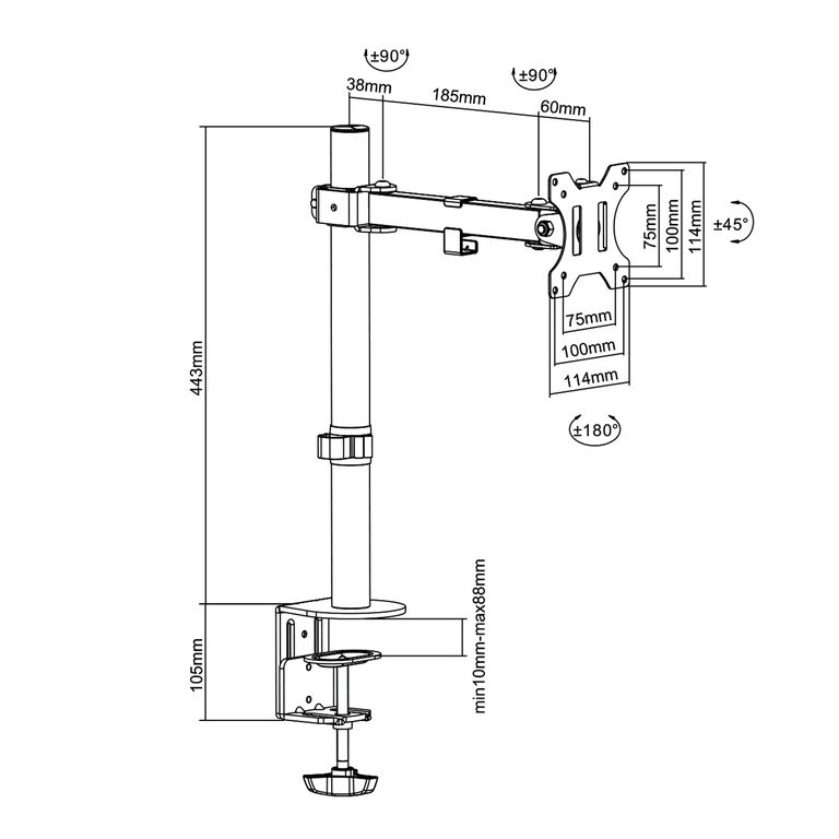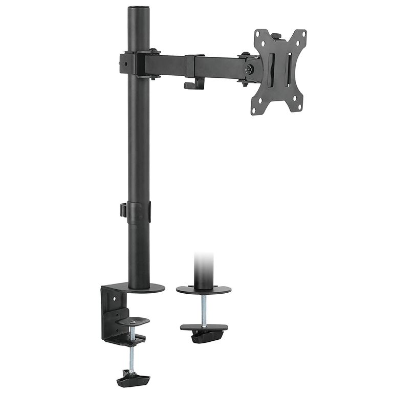Настольный кронштейн для монитора и ТВ iTECHmount MBES-02F поможет быстро и надежно закрепить Ваш монитор или телевизор на столе. Данная модель рассчитана на мониторы и телевизоры диагональю от 13” до 32”, с максимальным весом до 8 кг. 4 степени свободы позволят регулировать угол наклона монитора в диапазоне 45° вверх и 45° вниз, поворачивать монитор на 90° в обе стороны, а так же регулировать вынос монитора в диапазоне 38 мм - 283 мм от основания, а функция вращения на 180° в обе стороны даст возможность легко менять ориентацию положения экрана из горизонтальной в портретную и обратно.