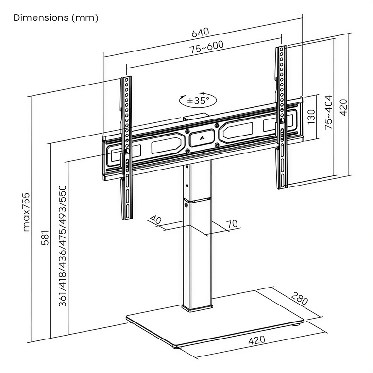 Поддерживаемый уровень высоты телевизора от основания: 361 или 418 или 436 или 475 или 493 или 550 мм