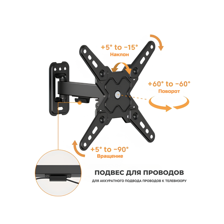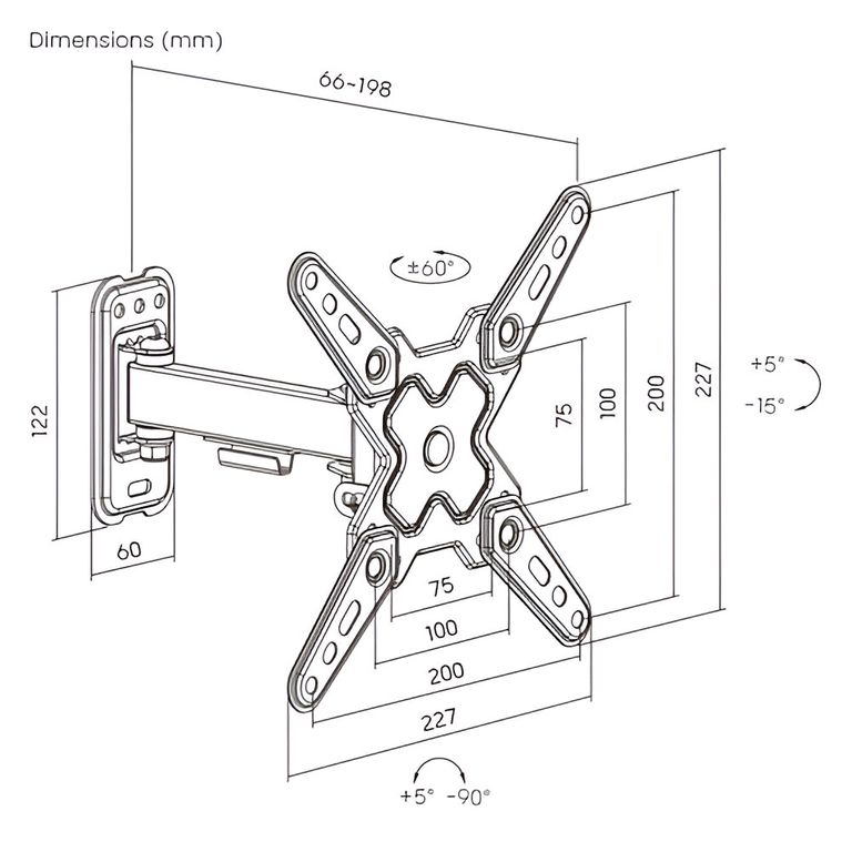 Настенный кронштейн для телевизора iTECHmount LCDN721 с функцией выноса, наклона, поворота и вращения экрана рассчитан на телевизоры диагональю от 13” до 43”, максимальным весом до 20 кг. Данная модель кронштейна имеет множество степеней свободы, позволяет регулировать угол наклона вашего телевизора в диапазоне до 5° вверх и до 15° вниз, повернуть экран телевизора до 60° в каждую сторону, а функция вращения экрана в диапазоне +5° / - 90° позволит зафиксировать телевизор в книжной или портретной ориентации. Функция выдвижения позволит регулировать отступ телевизора от стены в диапазоне от 66 до 198 мм.